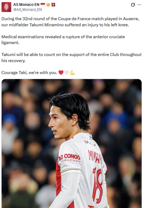 프랑스 클럽 AS모나코는 22일(한국시각) 공식 SNS를 통해 주전 공격수 미나미노 다쿠미의 부상 소식을 업데이트했다.