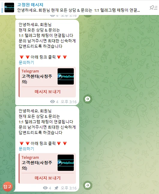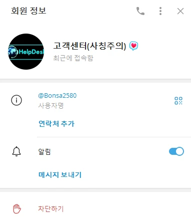 위의 내용은 사칭이며, 사칭한 업자의 텔래 단체방과 아이디 입니다.