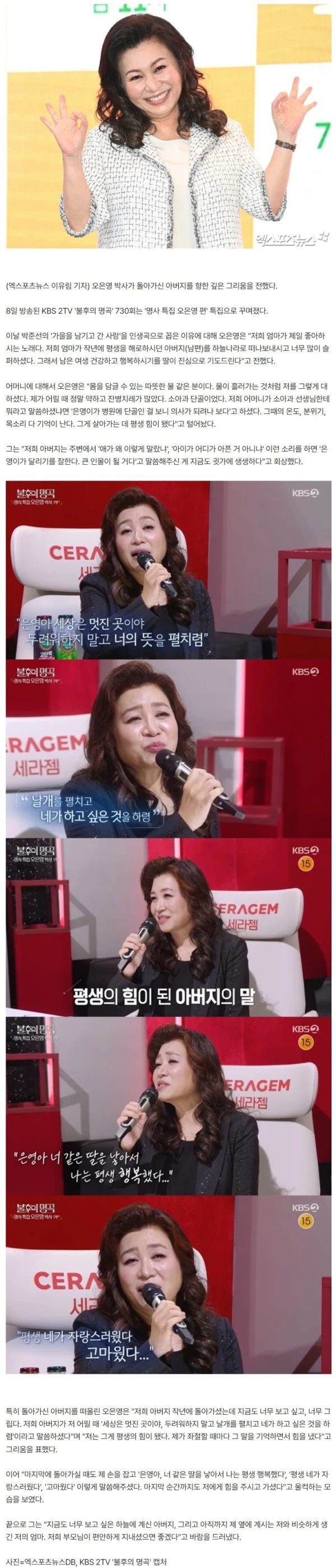 '부친상' 오은영, 父 먹먹한 유언 공개했다…"날 낳아 행복했다고, 너무 그리워" (불후)