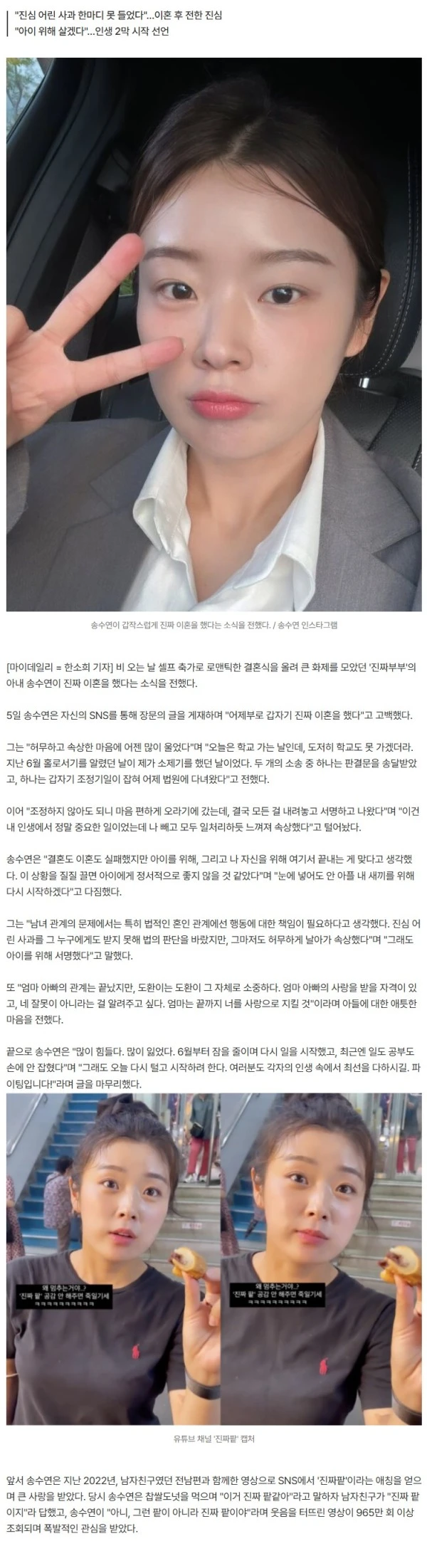 "어제부로 진짜 이혼했습니다"…'낭만 결혼식'으로 화제 모았던 송수연, 눈물의 고백