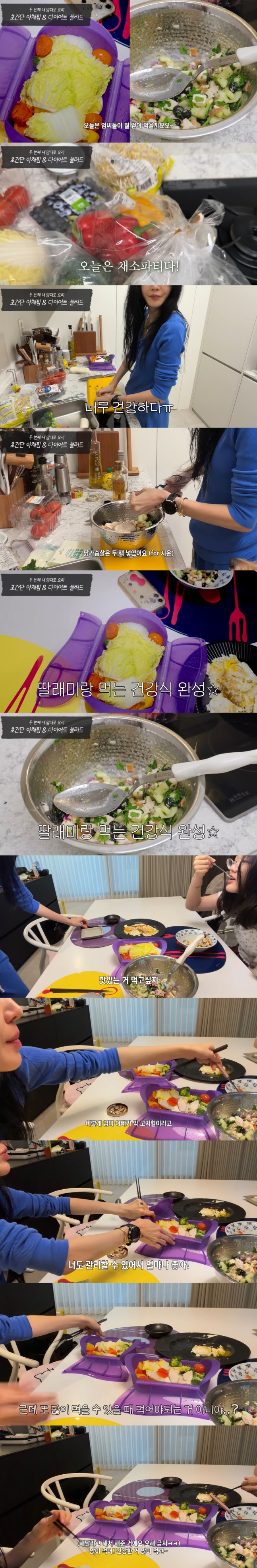 잠시 후 건강식이 완성, 윤혜진은 "닭가슴살 있으니까 좀 씹히지 않냐. 맛있는 거 먹고 싶냐"고 물었고, 지온 양은 고개를 끄덕여 웃음을 안겼다.