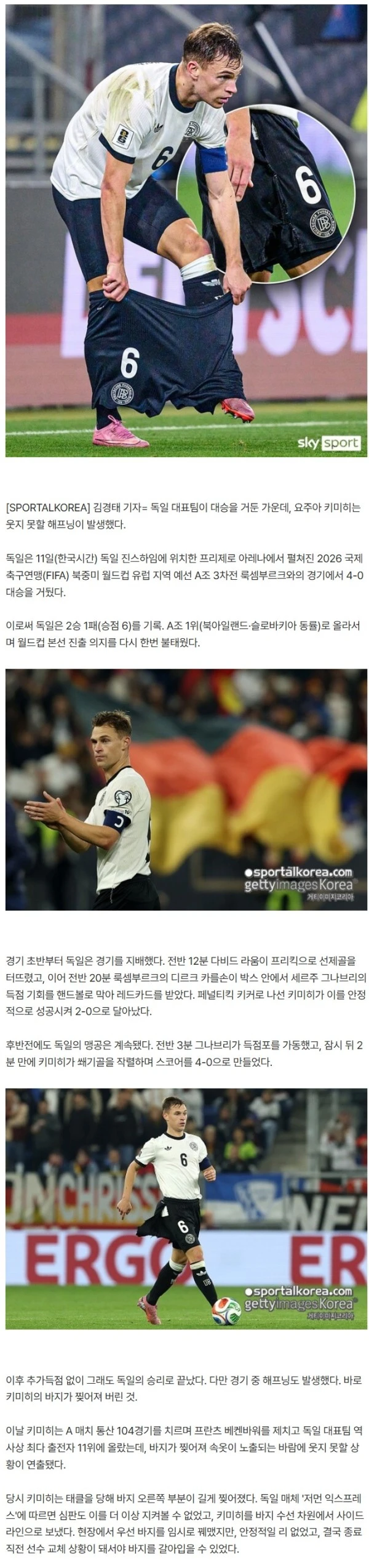'아이고 창피해!' 캡틴의 수모, 기록 세우는 날 바지 찢어져 '속옷 노출'→사이드 라인서 하의 강제 교체...다행히 獨, 룩셈부르크 상대 4-0 대승
